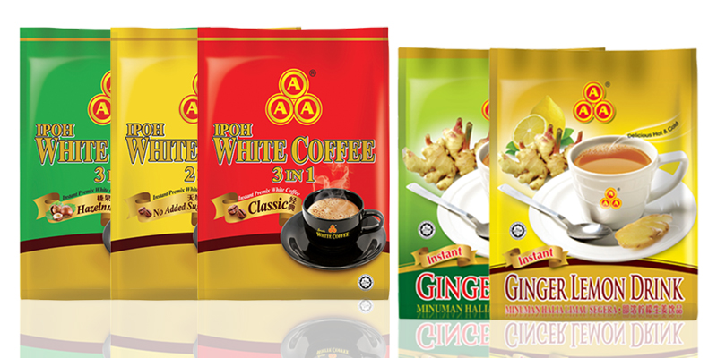 Products: AAA 3in1 Ipoh White Coffee(Hazelnut), AAA 2in1 Ipoh White Coffee(Less Sugar), AAA 3in1 Ipoh White Coffee(Original), AAA Ginger Drink, AAA Ginger Lemon Drink